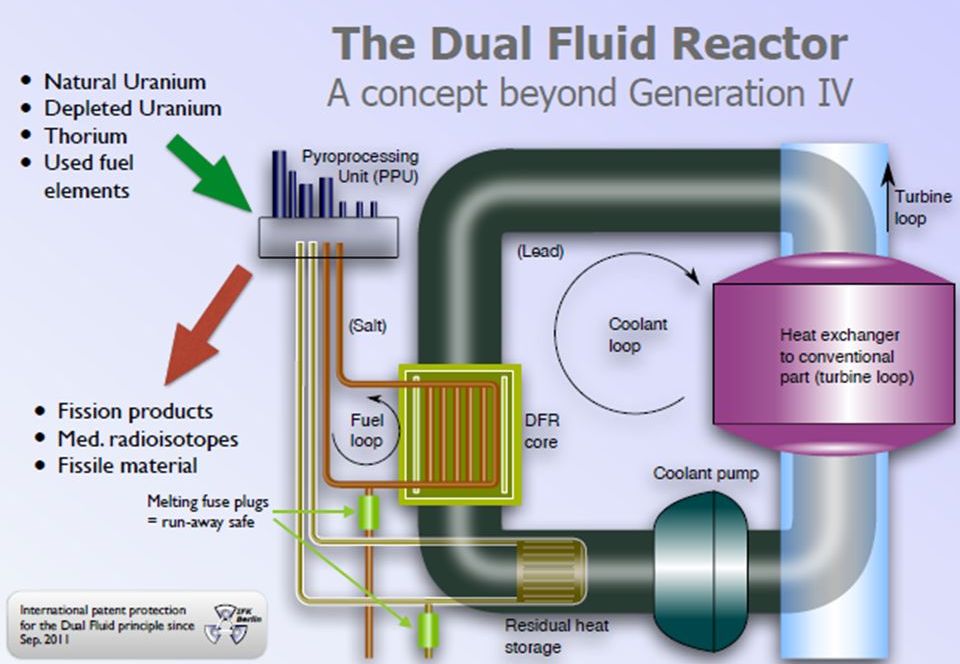 Je voudrais mentionner pour terminer que le concept de réacteur à fluide dual a été développé par un groupe de physiciens, incluant moi-même, à Institut de physique nucléaire du solide (IFK) à Berlin, en Allemagne. [5]