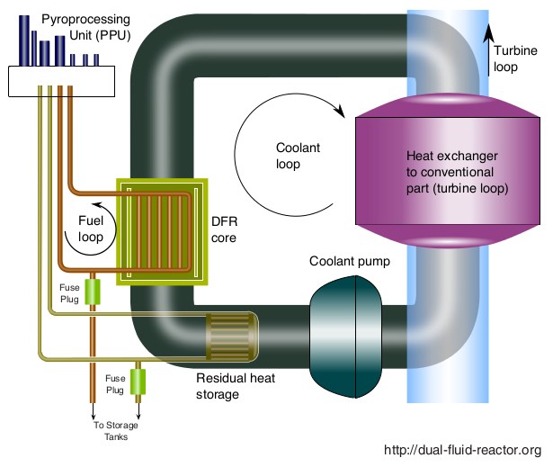 Certains isotopes radioactifs pourraient se former dans le plomb après un long séjour dans le réacteur, mais ils se transmutent en un isotope stable du plomb. De plus, le plomb ne ralentit pas les neutrons rapides autant que le sodium. Ainsi, un réacteur refroidi au plomb comme le DFR, duquel les produits de fission sont extraits en continu (car ceux-ci peuvent absorber les neutrons) contiendra un plus grand nombre de neutrons disponibles pour accomplir le travail.
