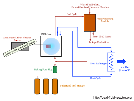 Par ailleurs, tous les isotopes utiles à la médecine ou à l’industrie (comme le molybdène-99/technétium-99m par exemple) peuvent être extraits en continu du réacteur pour être conditionnés et expédiés. De plus, dans le cas d’une perte d’agent de refroidissement (l’accident le plus sérieux dans un réacteur nucléaire) même avant que la température soit suffisamment élevée pour faire fondre les bouchons de secours, cette montée de la température au-delà de la température normale d’exploitation fait que le réacteur devient « sous-critique » et s’arrête de lui-même, à cause du coefficient négatif de température du DFR.