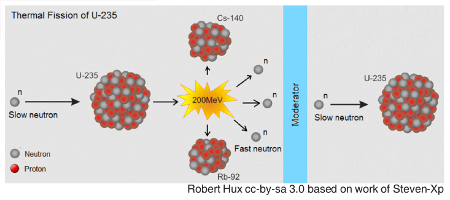 Dans un réacteur thermique, les neutrons doivent par conséquent être ralentis (et ils deviennent des neutrons thermiques). Ceci est accompli par l’ajout dans le cœur du réacteur d’un matériau léger que l’on appelle modérateur (c-à-d de l’eau, de l’eau lourde ou du graphite) qui est en mesure d’absorber de manière efficace le surplus d’énergie des neutrons.