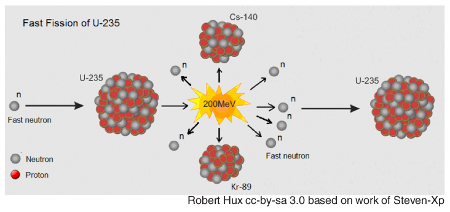 Ces neutrons supplémentaires peuvent également être utilisés pour transformer l’U-238 en Pu-239 fissible ; ainsi, pendant qu’ils consomment le combustible initial, les réacteurs à neutrons rapides produisent du combustible neuf à l’intérieur même du réacteur. Ces réacteurs consomment donc 100 % de l’uranium naturel.