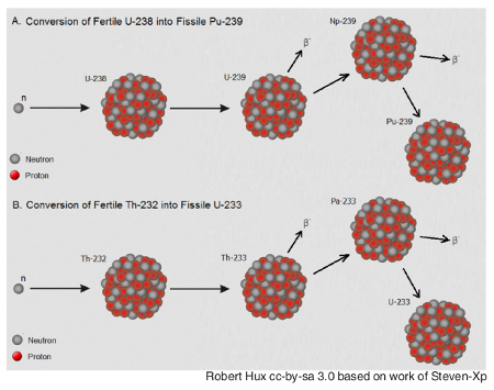 Troisièmement, même si un réacteur thermique ne peut fissionner les 99,3 % d’uranium restant (U-238), ou du thorium (Th-232), il peut convertir ces matériaux fertiles en isotopes fissiles du plutonium (Pu-239) et de l’uranium (U-233). Il produit aussi beaucoup d’autres éléments lourds appelés actinides, ainsi que des éléments de poids moyen appelés produits de fission.