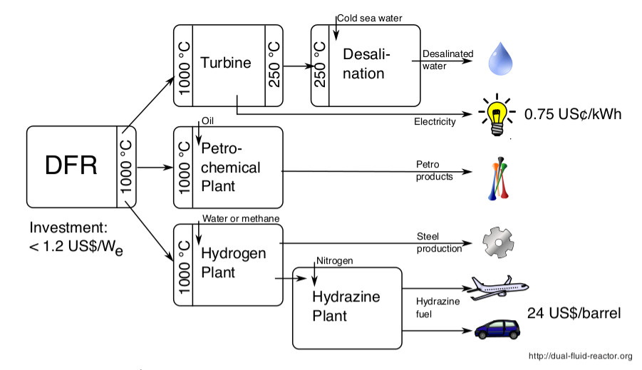 R/ Dr Ahmed Hussein – Notre réacteur, que nous avons baptisé Réacteur à fluide dual (DFR) [2], a été conçu pour pouvoir résoudre les problèmes qui subsistent avec les réacteurs actuels, qui sont à l’origine de certaines peurs. Certains concepts utilisés dans les réacteurs actuels ont leur origine dans le domaine militaire, à l’époque du Projet Manhattan, qui ont été adaptées pour l’usage civil. On s’est occupé des questions de sécurité, qui a été améliorée avec les générations de réacteurs civils qui se sont succédées, mais le prix payé a été élevé. Le résultat est que la construction des réacteurs munis de tous ces dispositifs de sécurité pour garantir une exploitation sécuritaire a fait monter le prix des réacteurs de manière significative. Cela dit, même si le coût de construction est élevé, les frais d’exploitation sont beaucoup plus faibles qu’avec les centrales thermiques.
