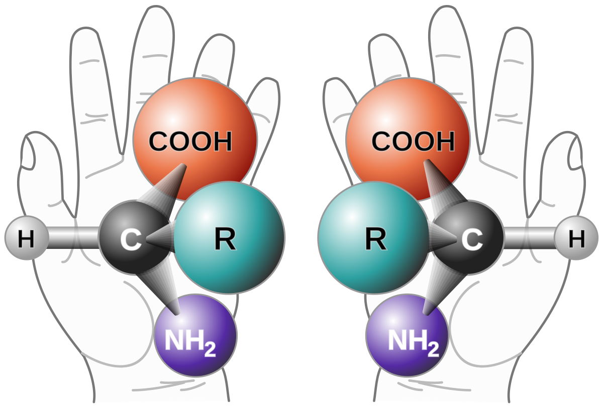 Une molécule est « chirale » si elle possède deux formes, dites énantiomériques, dont les images l’une de l’autre dans un miroir ne sont pas superposables, exactement comme la main gauche et la main droite chez l’homme.