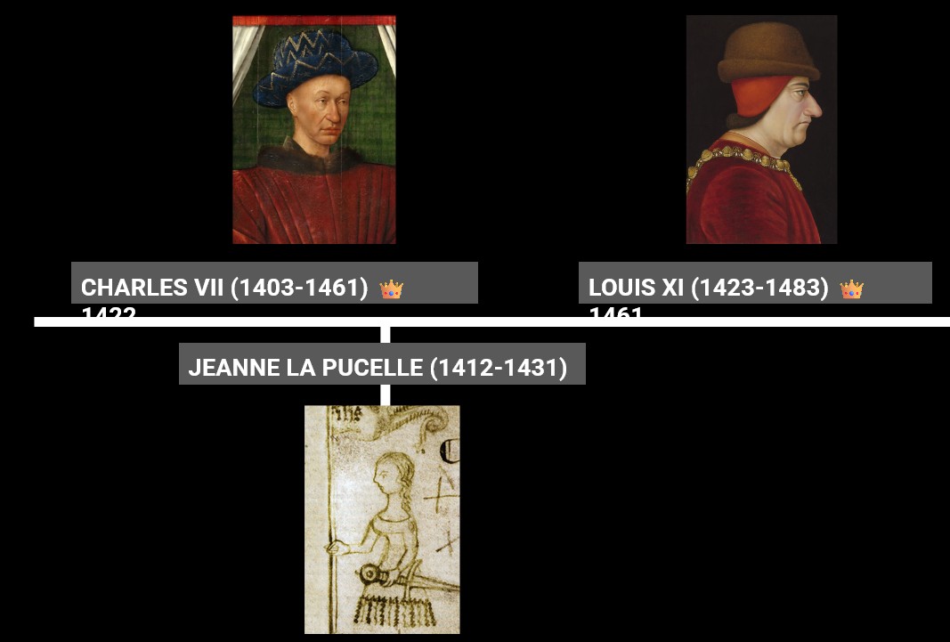 Louis XI est né en 1423. Il est le fils de Charles VII, dont la couronne est revendiquée par l’Angleterre, soutenue par les Bourguignons. Jeanne d’Arc, née en 1412, conduira Charles VII à Reims pour son couronnement en 1429 et sera brûlée en 1431 par les Anglais. Il est probable que Louis XI l’ait rencontrée à ses 7 ans à la cour de Bourges, au retour de Jeanne en 1929.