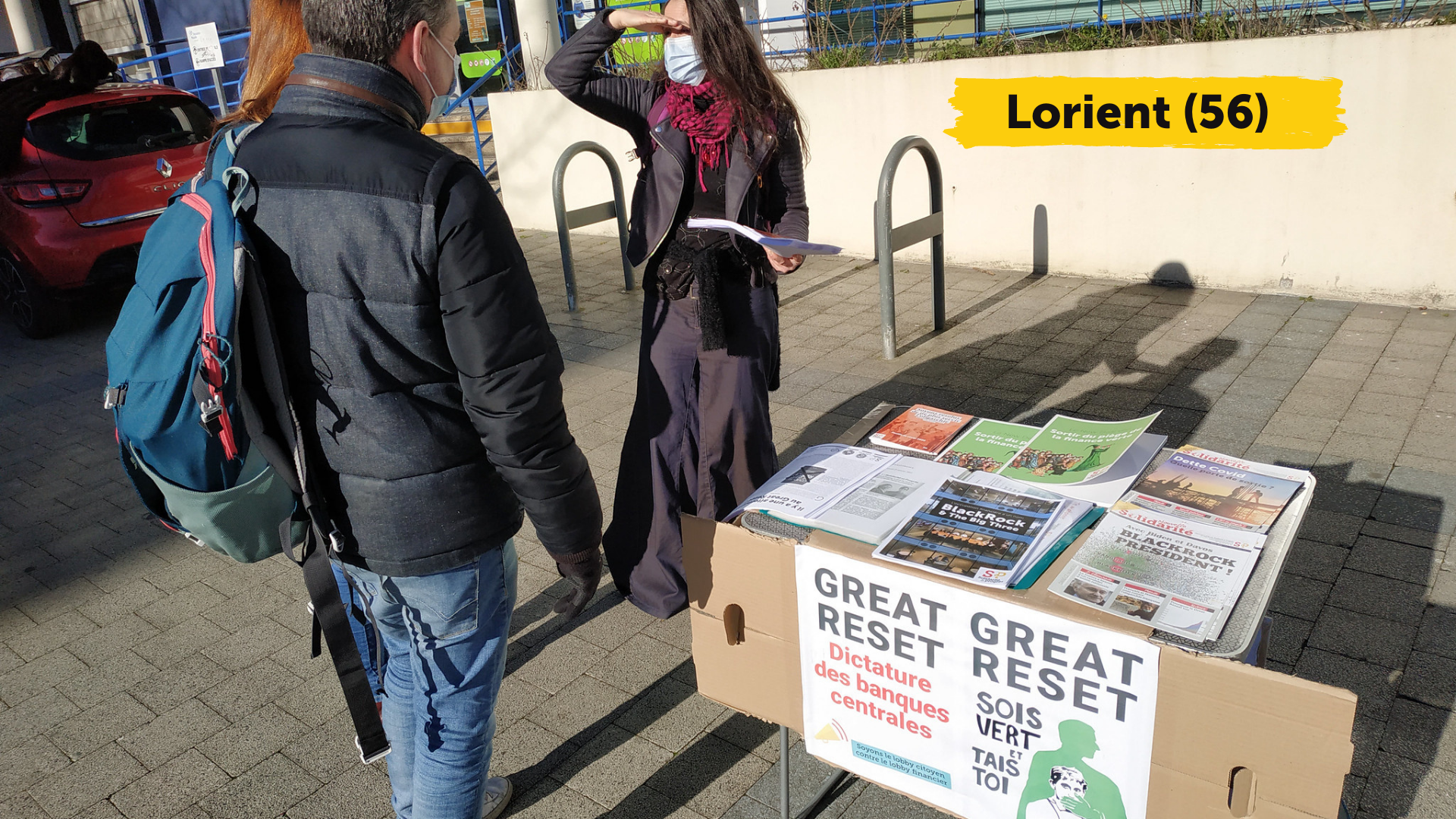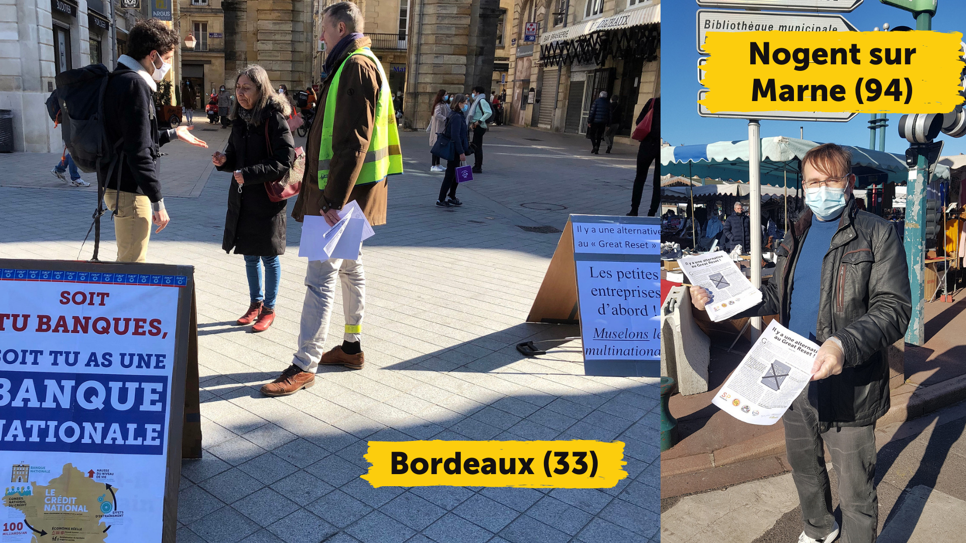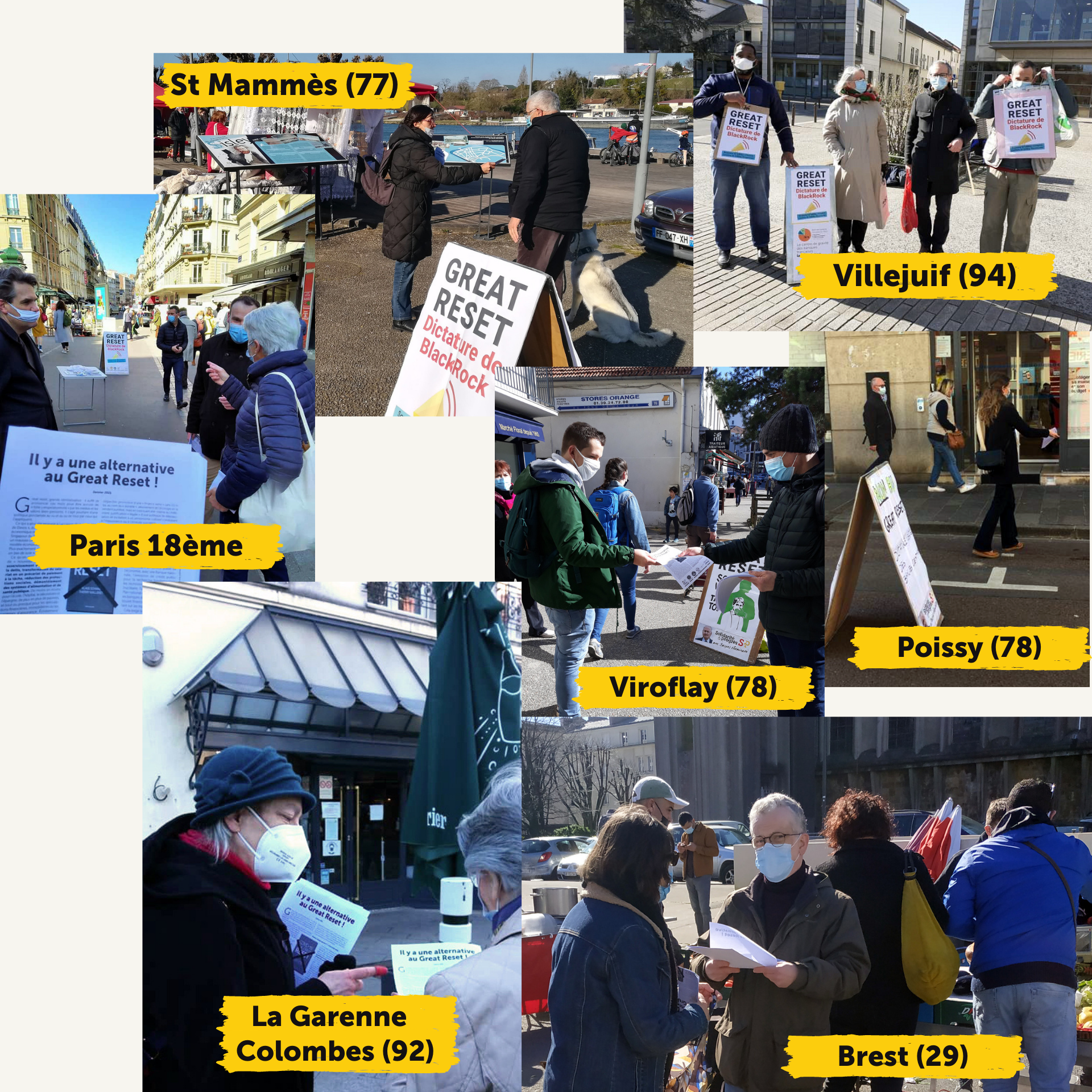 Samedi 27 février, S&P et plusieurs collectifs citoyens indépendants [1] ont lancé une mobilisation commune contre le Great Reset. Ainsi, dans une trentaine de villes en France, des équipes se sont montées — ou, parfois, un courageux militant s’est déplacé en solo — pour distribuer le tract Il y a une alternative au Great Reset ! et engager la discussion avec les passants.