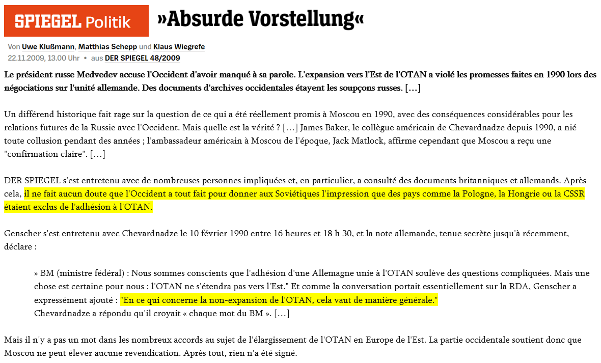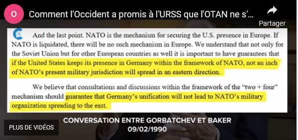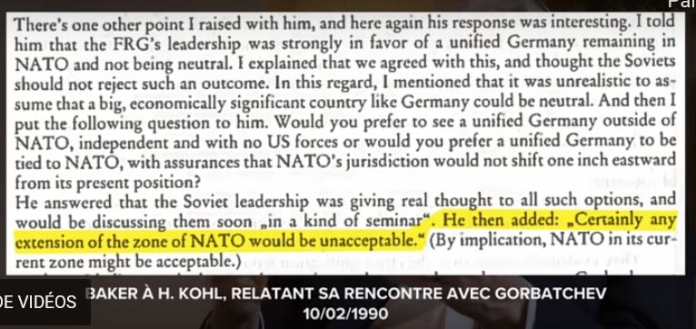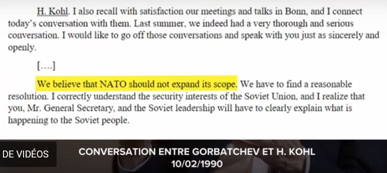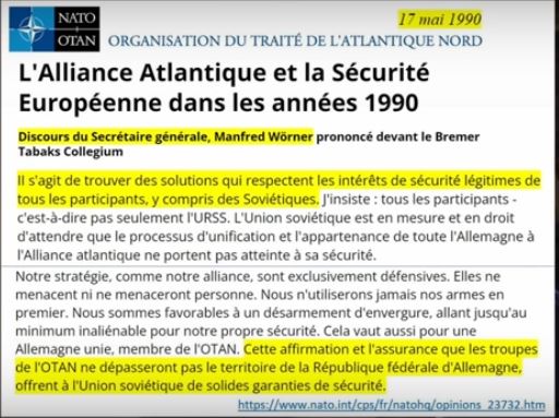 Si l’on veut bien y réfléchir, parce que l’argument qui va être utilisé, c’est que « vous n’avez pas demandé que ce soit inscrit dans le traité ». Ce qui est assez vrai, j’ai vérifié. Mais le propos a été tenu. J’ai demandé que l’on recherche dans les archives de l’OTAN, cela n’a pas été mentionné. C’est-à-dire que des gens aussi précautionneux que les Américains, et les gens de l’Alliance atlantique – nous – n’avons pas demandé que ce soit inscrit. C’est possible, mais par rapport au caractère de la discussion générale, c’est-à-dire une tentative de désarmement pour mettre fin au risque de guerre (parce que c’était cela qui comptait) et de préparer une autre période, dans le contexte de l’époque, qui était le désarmement, c’est logique. Cette discussion a donc eu lieu. D’abord parce que les Russes l’ont demandée, et parce que nous l’avons soutenue, moi le premier, et les Américains aussi. Et les Allemands, évidemment.