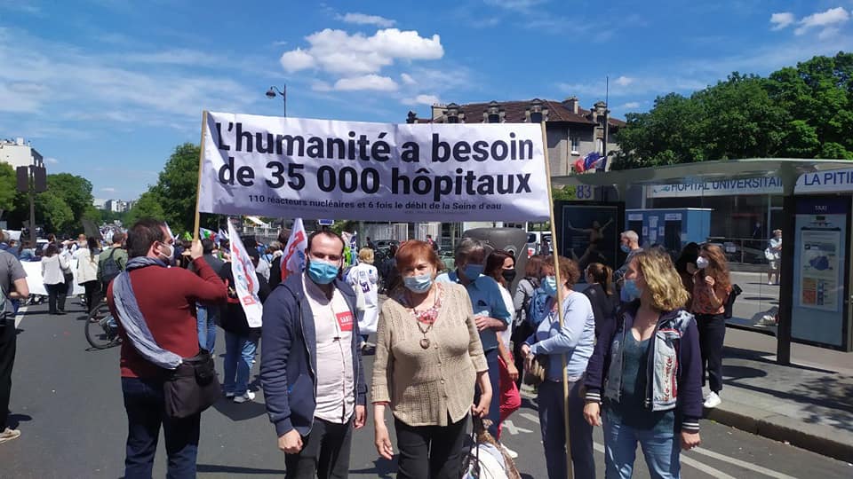 Tout en exprimant, lors de la manifestation du 29 mai, notre soutien et notre reconnaissance face à tant de dévouement du personnel soignant depuis un an, nous avons pu, à travers notre tract et notre banderole, apporter un principe de réalité tout à fait tangible : « L’humanité a besoin de 35 000 complexes hospitaliers – lesquels nécessiteraient l’équivalent de 110 réacteurs nucléaires et 6,5 fois le débit de la Seine en eau potable. »