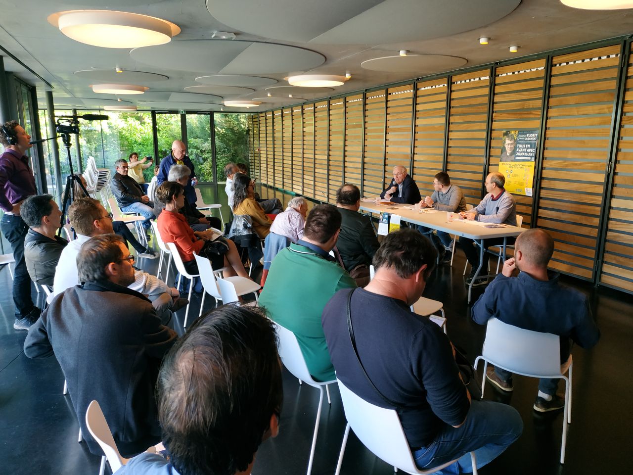 Bref, la mobilisation de ce début de semaine distribuera jusqu’au dernier des 6000 tracts d’invitation à la réunion, pour y convier un maximum de citoyens. Un véritable défi, compte-tenu du découragement et du rejet vis-à-vis de la politique, largement exprimés par les habitants que nous croisons. Bien qu’ayant couvert près de 60 % des quartiers du Taillan-Médoc en porte-à-porte, deux nouvelles personnes seulement se rendent à la réunion du jeudi. Mais près d’une quinzaine de citoyens, sympathisants de longue date, famille, amis et soutiens de Jonathan, et quelques autres rencontrés pour la première fois, après plusieurs échanges téléphoniques ou via les réseaux sociaux, sont venus écouter ce que notre jeune candidat ainsi que Jacques Cheminade avaient à dire. Avec en prime, une petite radio locale, Radio Mérignac, venue interviewer l’ancien candidat à la présidentielle et l’actuel candidat aux législatives.