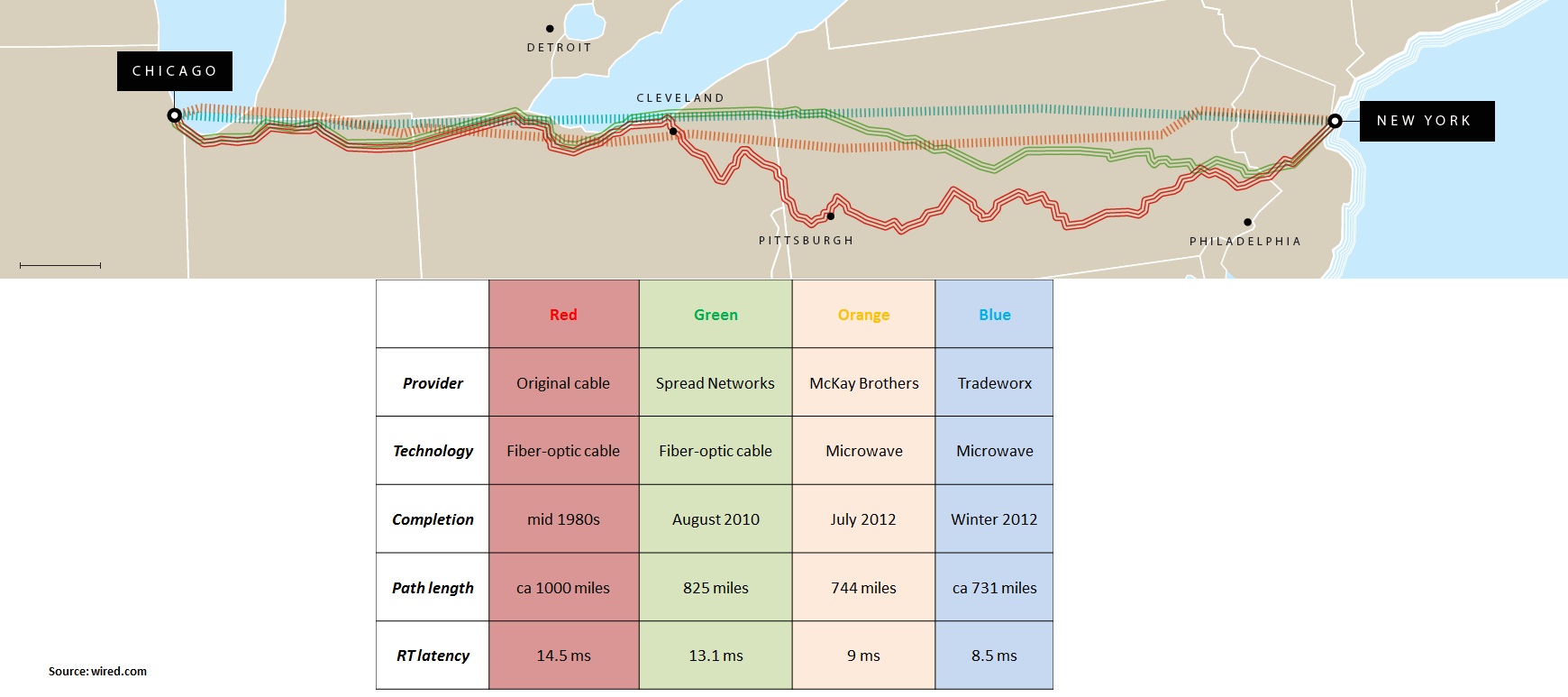 Ainsi, en juin 2010, la société américaine Spread Network a inauguré un nouveau câble de fibre optique reliant Chicago au New Jersey (sur une distance de 1330 kilomètres), pour un coût total d’environ 300 millions de dollars. L’objectif : relier les serveurs de la bourse de Chicago à ceux du NASDAQ (dans le New Jersey, à quelques kilomètres de Wall Street) en moins de 13 millisecondes aller-retour, pour permettre aux traders haute-fréquence de profiter de potentielles anomalies sur les marchés. Pour vous donner une idée, 13 millisecondes pour 2660 kilomètres (aller-retour), cela fait donc une vitesse d’environ 200000 kilomètres par seconde : une vitesse proche de la vitesse de la lumière.
