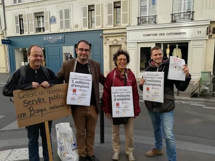 - Mardi 2 octobre : premières distributions du tract « Créons 5 millions d’emplois grâce au crédit public » ; 18 000 tracts diffusés la première semaine ; objectif : 500 000 tracts distribués au plus vite. Pour rejoindre une équipe de distribution ou simplement recevoir des tracts par la Poste : 01 76 69 14 50 ou suivre ce lien.