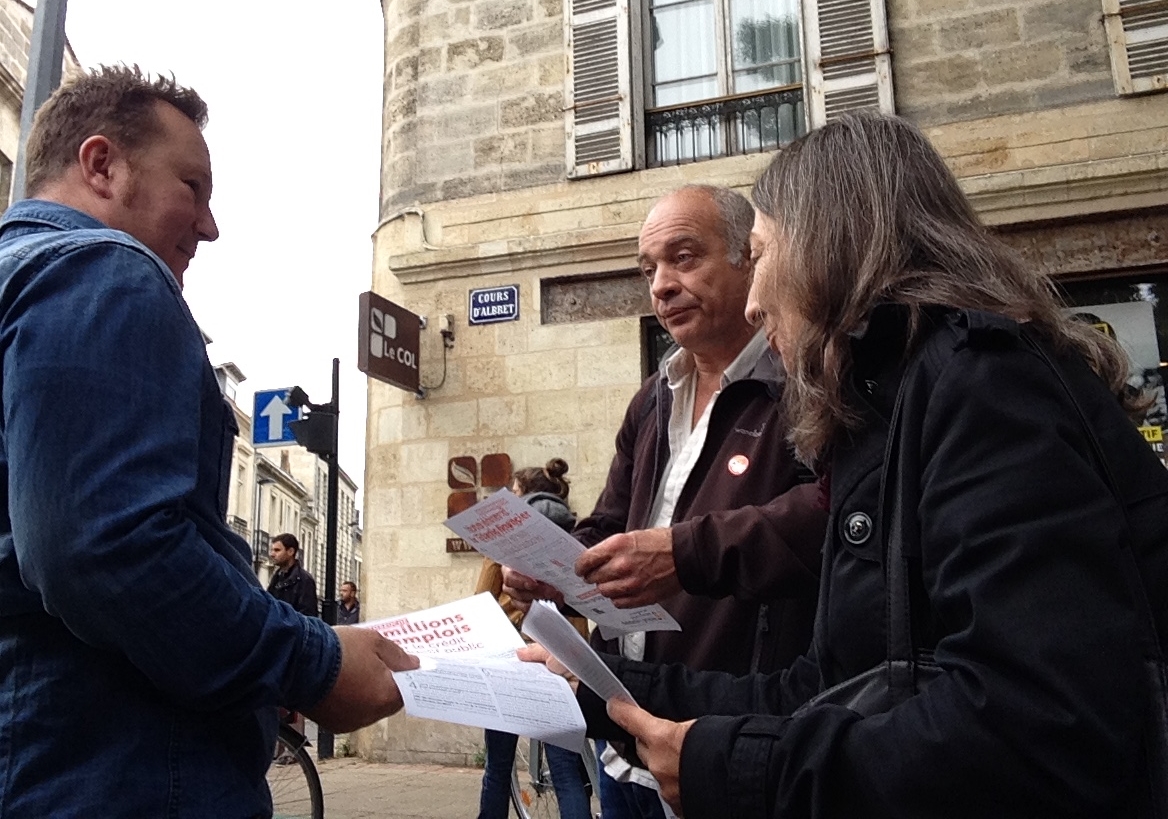 —Bordeaux : 200 tracts distribués par Daniel et Aline. Daniel est interviewé par la télévision locale TVB33 sur nos mesures pour empêcher le Titanic financier de nous emporter et de notre plan de relance à cinq millions d’emplois en cinq ans.