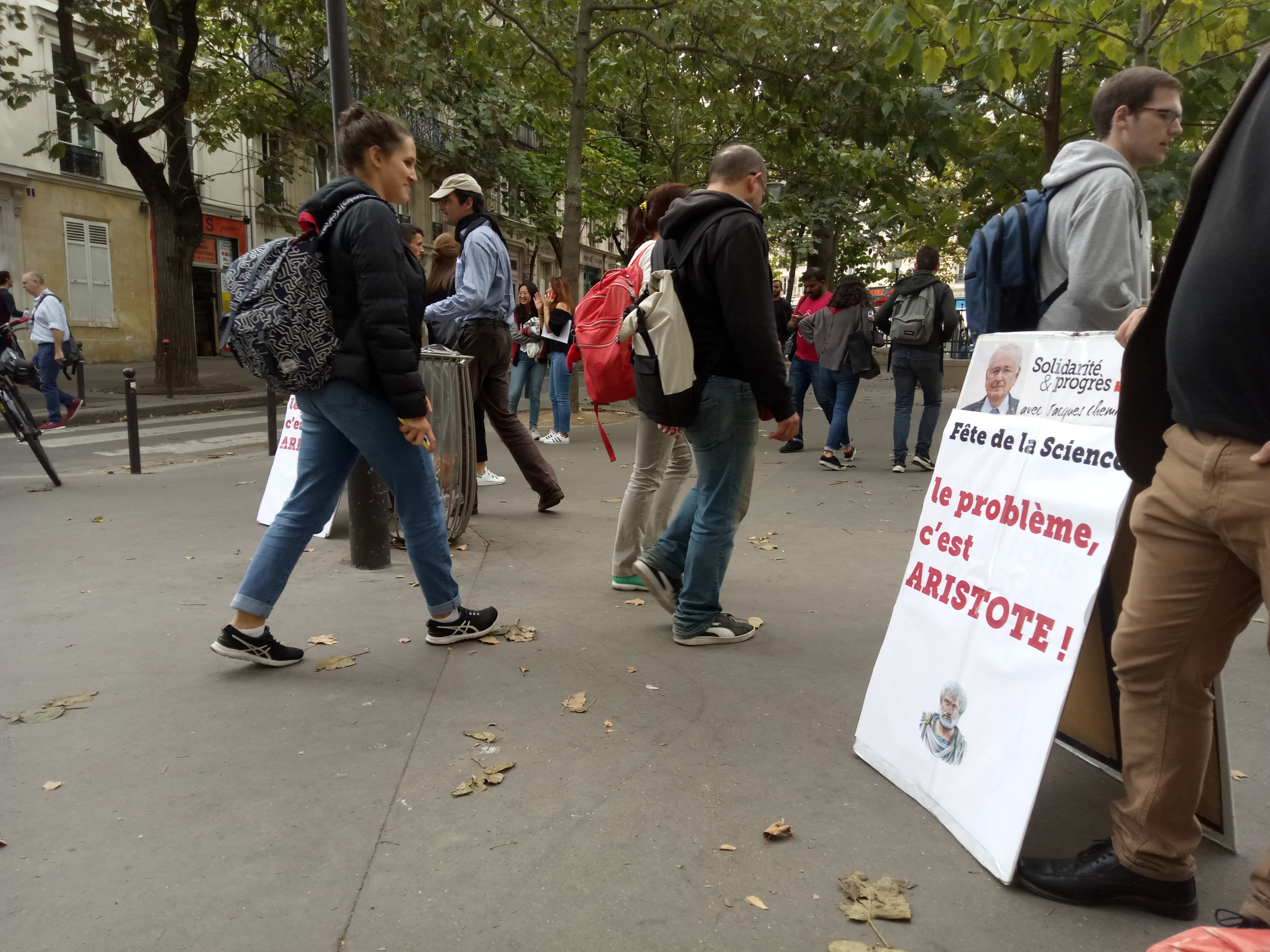« Pourquoi attaquez-vous Aristote ? », « Pourquoi un parti politique s’intéresse-t-il à la pensée philosophique et scientifique ? », « C’est quoi l’empirisme ? », « Pourquoi faites-vous des liens entre la politique, l’art et la science ? »... Un professeur de physique est venu enthousiaste à notre table militante : « Vous avez parfaitement raison ! Savez-vous qui est à l’origine de la pensée binaire ? Aristote ! Le principe de la non-contradiction ! Comment voulez-vous avancer avec cette façon de penser en science, ou même dans un débat ? Je n’arrête pas de le dire à mes collègues chercheurs. »