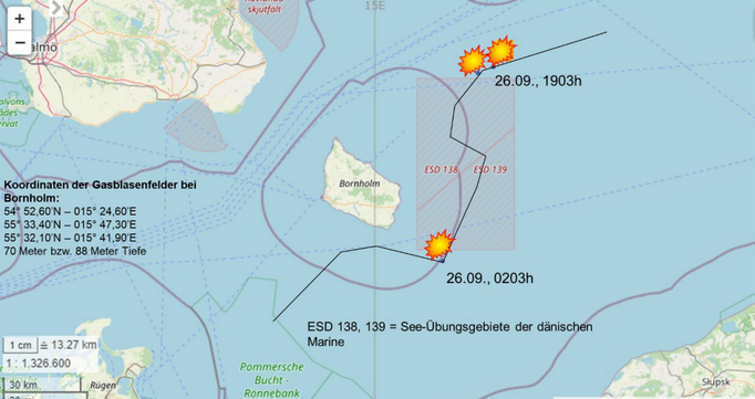 On peut affirmer que les champs de bulles de gaz identifiés en mer Baltique correspondent exactement à l’emplacement des explosions au fond de la mer, car la dérive des remontées de gaz ne peut être importante depuis une si faible profondeur. En revanche, les informations des sismologues concernant l’épicentre des explosions détectées sont plus imprécises, ce qui est probablement dû aux limites des appareils de mesure utilisés.