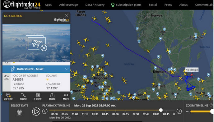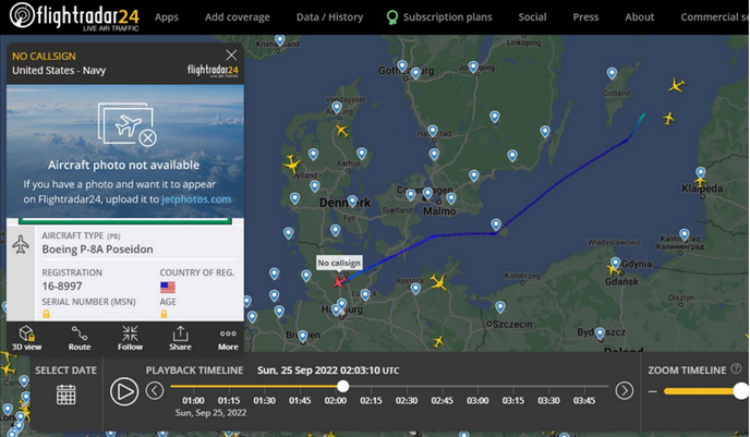 Un avion de patrouille maritime américain (le symbole de l’avion en rouge) le 25 septembre au-dessus de la mer Baltique, sa trajectoire étant indiquée par la ligne bleu foncé. Les symboles bleu clair sont des aéroports.