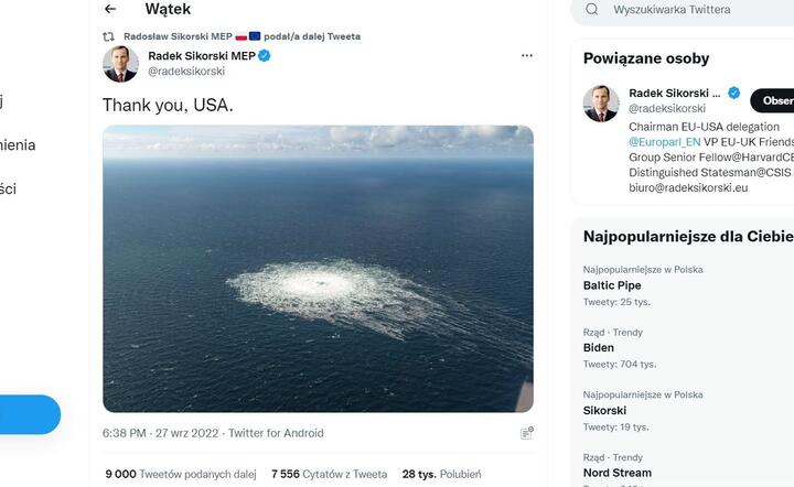 Pourtant, même si à ce stade l’on ne peut tirer aucune conclusion hâtive, le moins que l’on puisse dire est que le coupable ne fait pas beaucoup d’efforts pour se cacher. Dès le lendemain des explosions, l’actuel eurodéputé démocrate-chrétien Radek Sikorski, ancien ministre des Affaires étrangères et de la Défense de la Pologne, a écrit « Thank You, USA » sur Twitter, à côté d’une photo de la mer au-dessus de la zone détruite des pipelines. Il a continué à se réjouir, toujours sur twitter :