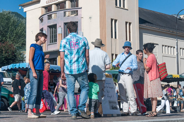 C’est sur la place du forum, au cœur de la ville, samedi jour de marché, que nous sommes intervenus. Entre vacanciers, habitants de la vallée et des hameaux environnants, la foule était au rendez-vous. Peu coutumière des interventions militantes hors périodes électorales, l’accueil a été chaleureux et curieux. D’autant plus que la population avait de quoi raconter.