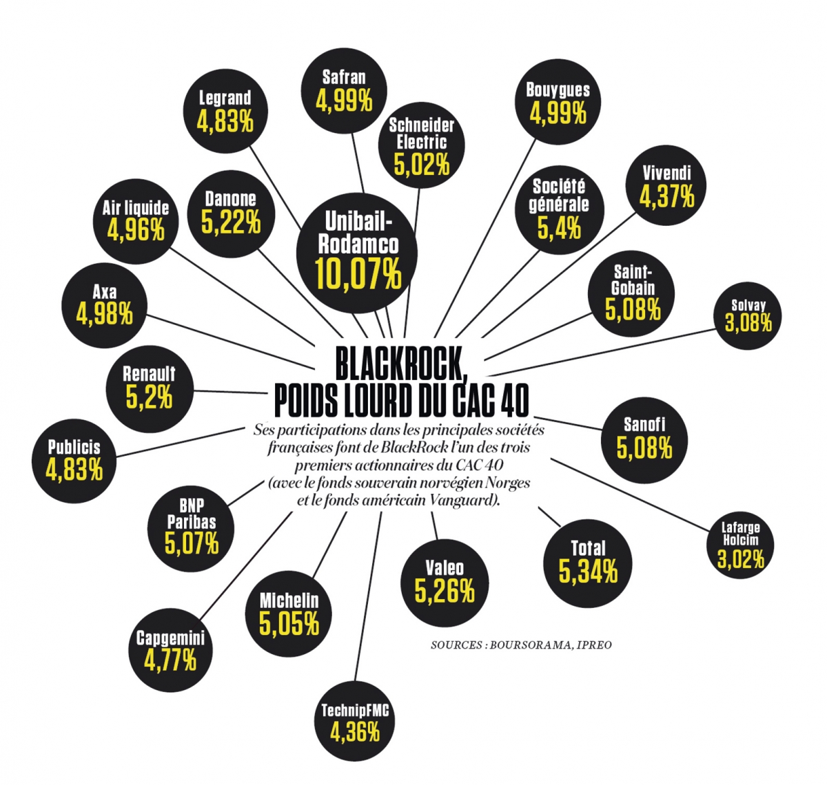 BlackRock possède aujourd’hui des participations significatives dans 18 des 40 sociétés du CAC40, l’indice des valeurs phares de la Bourse de Paris comme AXA, Sanofi, Safran, la Société Générale, BNP Paribas, Schneider Electric, Michelin, Vivendi, Accor Hotels ou Lafarge Holcim.