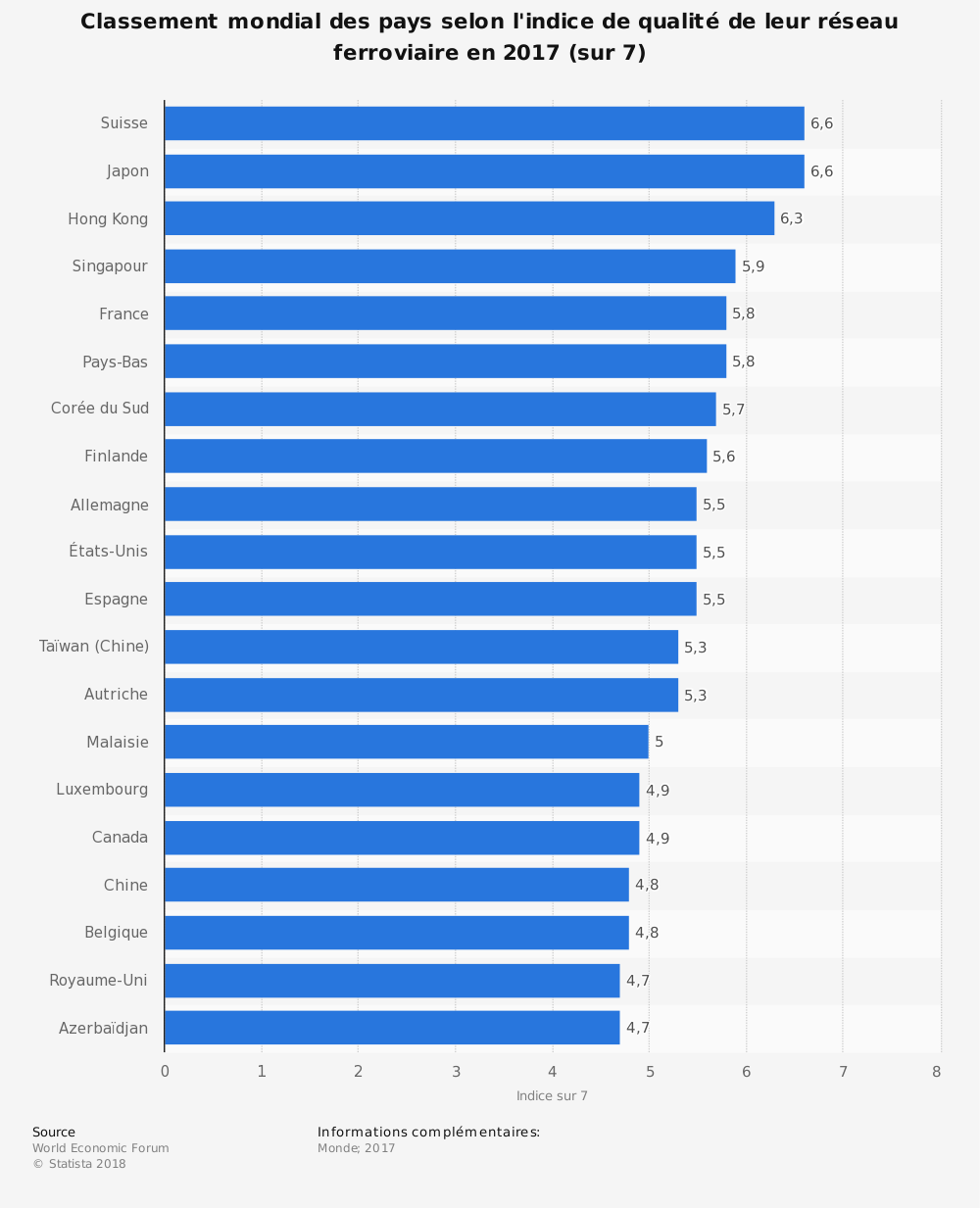 La première place revient à la Suisse, où les chemins de fer sont aux mains d’une société de droit public dont le capital est détenu en totalité par l’Etat, donc 100 % publique.