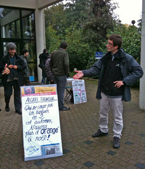 Déterminés à mobiliser les employés du Technopôle « Atalante » de Rennes, site pionnier dans les TIC (Technologies de l’Information et des Télécommunications) depuis les années 1980, Alexandra et moi-même, militants de Solidarité et Progrès, sommes allés distribuer tôt le matin la pétition pour un Glass-Steagall global, aux portes de l’entreprise Orange, voisine de Thomson et Alcatel actuellement soumises à des plans de licenciements. Deux matins de suite, panneaux autour du cou affichant « Pour Hollande, le faux Glass-Steagall, c’est maintenant ! Ici, on à le Vrai ! », les salariés ont bien accueilli notre impertinente insistance.