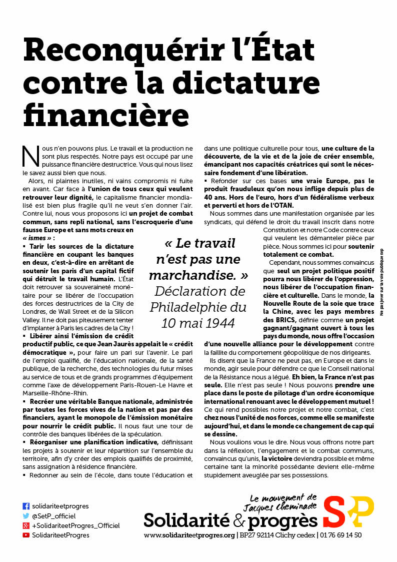 Alors, ni plaintes inutiles, ni vains compromis ni fuite en avant. Car face à l’union de tous ceux qui veulent retrouver leur dignité, le capitalisme financier mondialisé est bien plus fragile qu’il ne veut s’en donner l’air. Contre lui, nous vous proposons ici un projet de combat commun, sans repli national, sans l’escroquerie d’une fausse Europe et sans mots creux en « ismes » :