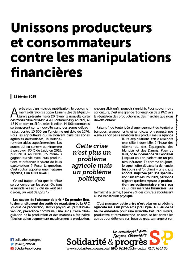 Les causes de l’absence de prix ? En premier lieu, le démantèlement des outils de régulation de la PAC (quotas de production, stocks physiques, prix d’intervention, préférence communautaire, etc.). Cette dérégulation de la production et des marchés a fait naître l’illusion qu’en augmentant massivement la production, chacun allait enfin pouvoir s’enrichir. Pour sauver notre agriculture, c’est une grande réorientation de la PAC vers la régulation des productions et des marchés que nous devons obtenir.
