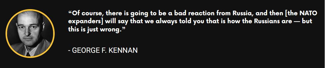 Il me paraît essentiel de relire un extrait de The Nuclear Delusion : Soviet-American Relations in the Atomic Age (1982) de George Kennan (il suffit de remplacer URSS par Russie) :