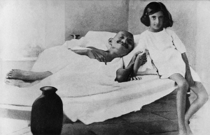 On le voit ici au terme d’une de ses multiples grèves de la faim, et l’enfant qui lui apporte son premier jus d’orange est la fille de Nehru, la future Indira Gandhi (1917-1984), Premier ministre d’Inde.