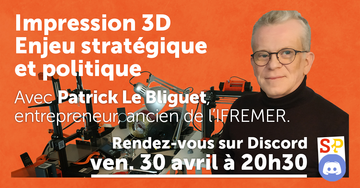 Les grands auteurs de science-fiction l’ont imaginée pour décrire le futur. Aujourd’hui, l’impression 3D est devenue réalité. Deviendra-t-elle la technologie clé pour une troisième révolution industrielle ? Un atout pour la relocalisation de notre industrie ? Explications ce 30 avril à 20h30 sur le Discord S&P (https://discord.gg/eZckuZM).