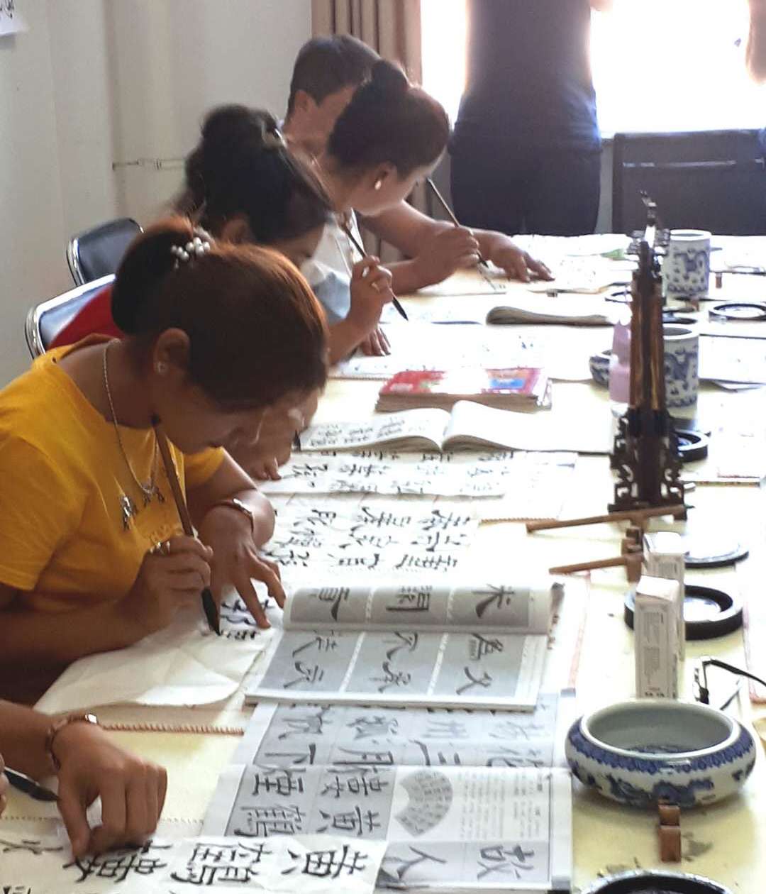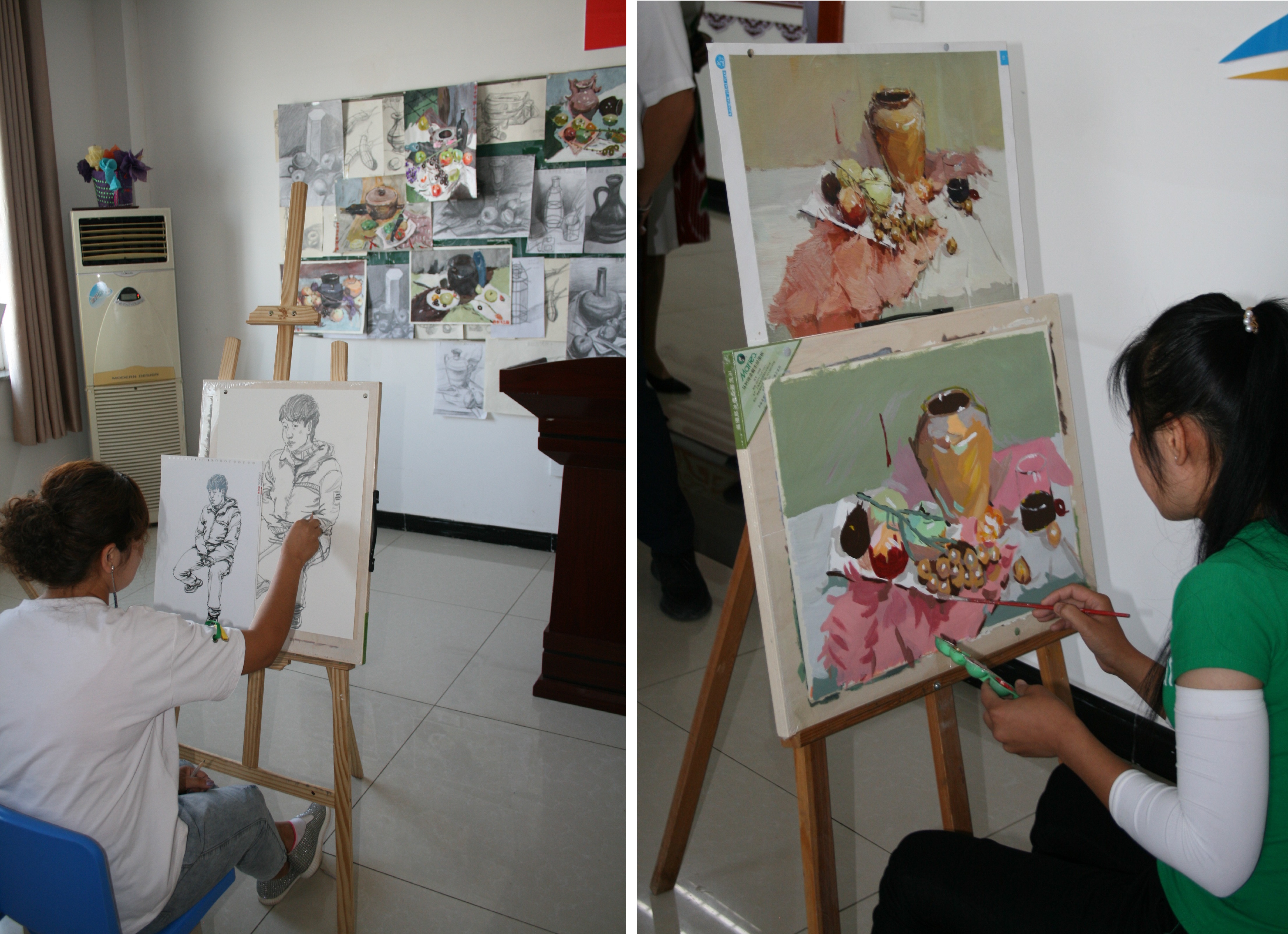 En dernier, nous arrivons aux formations artistiques, très importantes pour toute stratégie de réhabilitation. Entre 8 et 10 personnes suivaient des cours d’art. Elles apprenaient à copier la figure humaine et la peinture à l’aquarelle (16 – 17) ; dans une autre pièce, d’autres faisaient de la calligraphie, copiant des caractères en Mandarin, traduisant parfois entre l’Ouïghour et le Mandarin (18) ; d’autres encore, chantaient en chœur avec grand plaisir, des chansons locales, accompagnées par des musiciens avec des instruments à cordes, du genre des balalaïkas.
