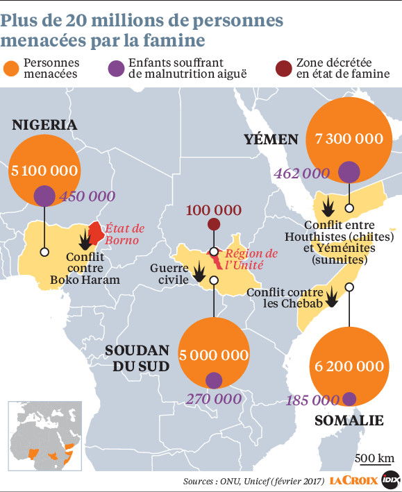 « Les Nations Unies lancent un avertissement : le monde fait face à sa pire crise humanitaire depuis la fin de la Seconde guerre mondiale, avec plus de 20 millions de gens confrontés à la faim et à la famine dans quatre pays », a-t-il déclaré.